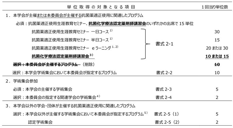 2026年度より、選択項目の本委員会が主催する抗菌化学療法認定薬剤師講習会が、必須項目に含まれることとなりました。また、この変更に伴い、講習会の単位につきましても2026年度開催分より15単位に変更となります。